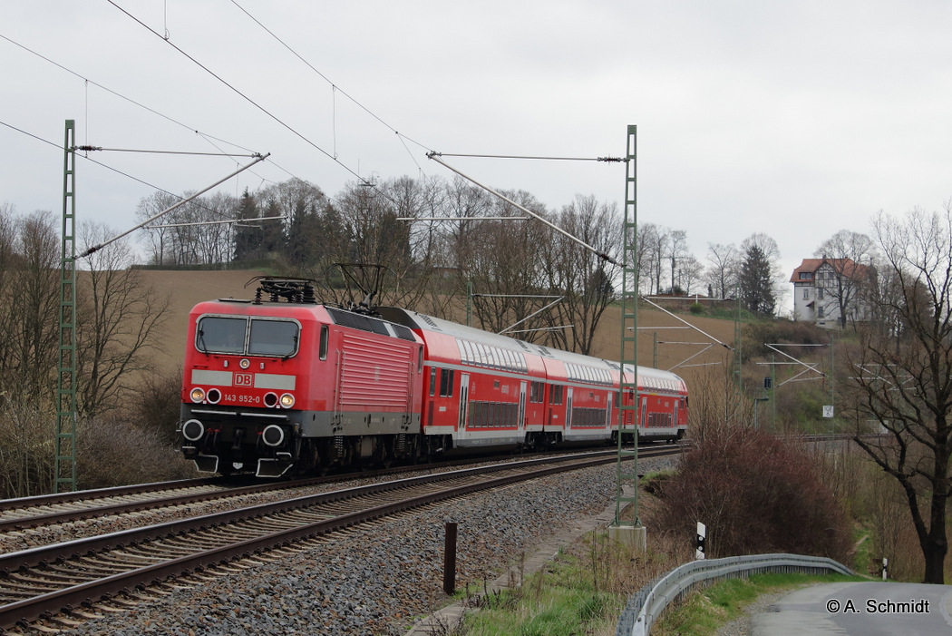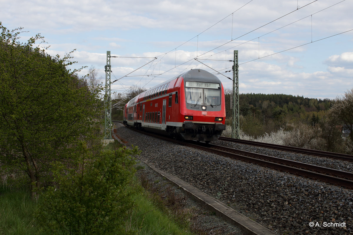 Mit dem "kleinen Fahrplanwechsel" am 12.06.2016 wird unter anderem der RE3 Dresden - Hof von der MRB betrieben. Damit endete am 11.06.2016 der Einsatz der BR143 mit Doppelstockeinheiten im RE-Verkehr. Gleichzeitig war es der Abschied von DB-Regio aus der Region Vogtland und Westsachsen. Der vorletzte Zug mit BR143 bzw von DB Regio ab Hof in Richtung Sachsen, und gleichzeitig der letzte durchgehende Zug bis nach Dresden war RE 4775 Hof - Dresden, der hier abfahrbereit mit 143 829 in Hof steht. Philipp Popp