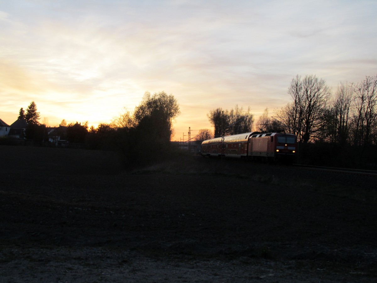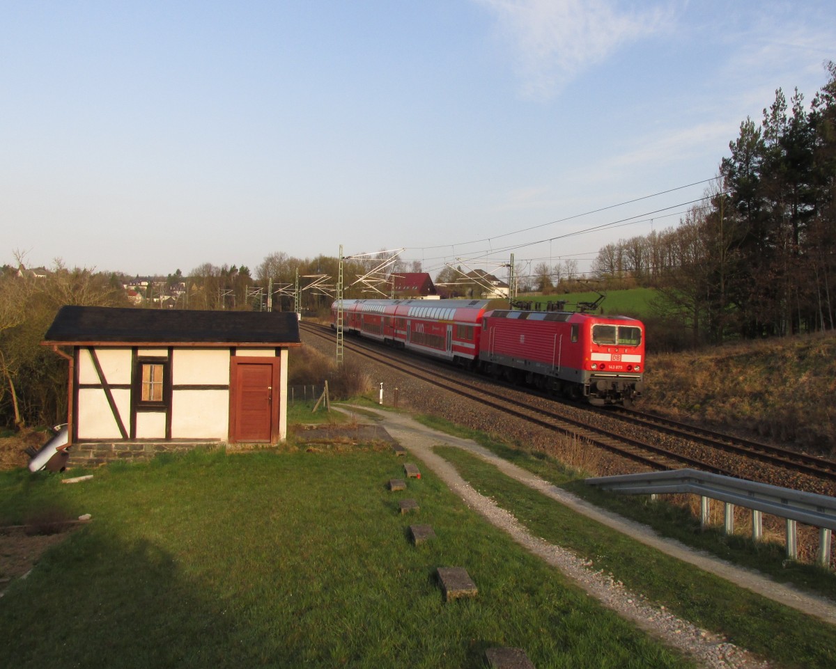 RE 3 mit Dostos und der 143 952 auf dem Weg von Dresden nach Hof, hier aufgenommen auf der Elstertalbrücke bei Jocketa am 21.04.2015 Andreas Schreiber