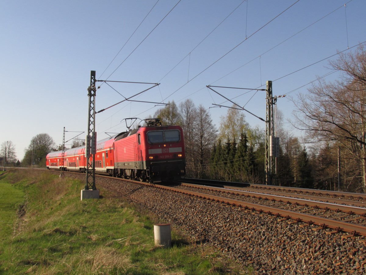 143 585-8 fährt am 06.05.2015 mit der RB 17231 (Zwickau (Sachs) Hbf - Dresden Hbf) am Block n Niederhohndorf vorbei. Aufgrund des Streikes hat man den RE 3 komplett eingestellt und die RB 30 ist nur noch im Zweistundentackt gefahren. Matthias Hartmann