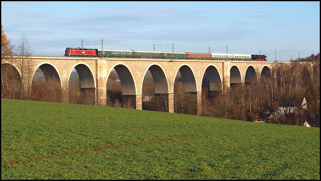 03.12.2011. Sonderzug mit WFL-Lok 20 und 52 8131 als Schiebelok bei Überquerung des Frankensteiner Viaduktes zwischen Freiberg und Oederan auf der Sachsen-Franken-Magistrale.