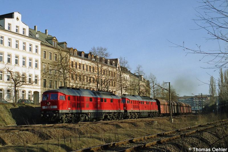 232 135 und ihre "Schwester" befördern an einem sonnigen Märzmorgen 2005 den Kohleleerzug nach Chemnitz/Siegmar. Hier vor der Kulisse schöner Chemnitzer Altbauten an der Rembrandtstrasse. Thomas Oehler