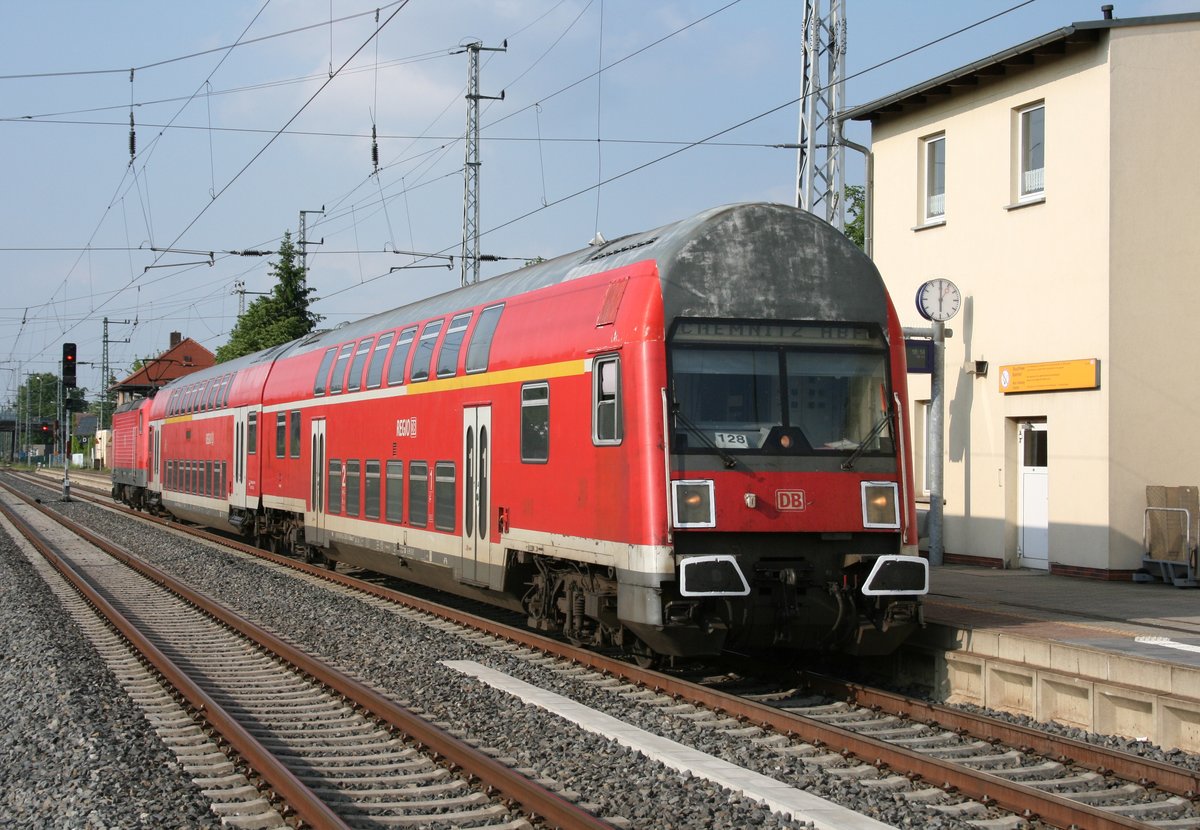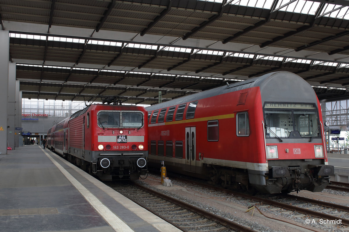 Letztmaliger Dostoverkehr mit 143er Vorspann am 11.6.2016, Hier im Bild RB nach Elsterwerda mit der 143 283 mit Abschiedsschild im Hbf Chemnitz. Andreas Schreiber
