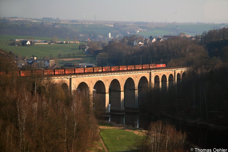 Am 12.04.07, ist es wieder mal eine 155, welche den Kohlezug Spreewitz-Chemnitz zieht. Hier befährt sie gerade den imposanten Diedenhainer Viadukt in Waldheim. Thomas Oehler
