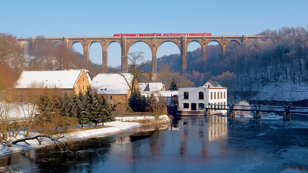 223 144 überquert am 13.02.2016 mit MRB 74779 den 1869 bis 1871 errichteten Göhrener Viadukt. An dessen Fuß befindet sich, direkt an der Mulde gelegen, die Göhrener Mühle. Auf der rechten Talseite verläuft die Muldentalbahn Glauchau - Großbothen. Christopher Pätz