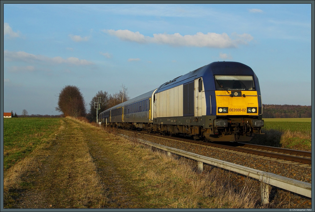 Die bei der MRB im Einsatz stehende DE2000-02 trägt noch die Lackierung der NOB als sie am 13.02.2016 mit MRB 74781 Richtung Chemnitz unterwegs ist. Kurz vor Geithain passiert der RE einen Einschnitt. Christopher Pätz