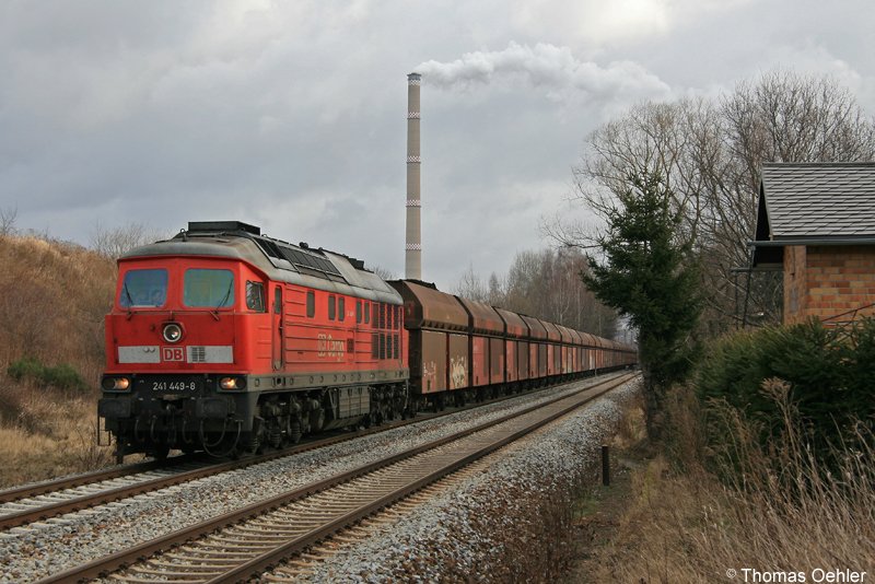 241 449 zieht den Kohlezug auf dem Hauptgleis nach Leipzig am Bf Chemnitz-Küchwald vorbei, um ihn kurz darauf in selbigen zurück zu drücken; Aufnahme vom 11.02.07. Thomas Oehler