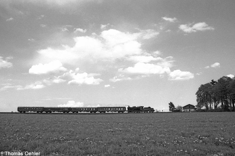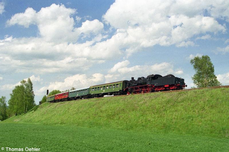 38 205 mit dem Sonderzug zum 125jährigen Streckenjubiläum Chemnitz - Borna am 11.05.97 auf der Rückfahrt nach Chemnitz. Hier kurz nach Hp Wittgensdorf-Mitte. Thomas Oehler