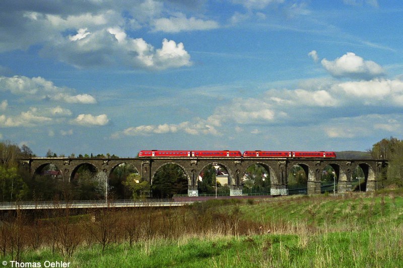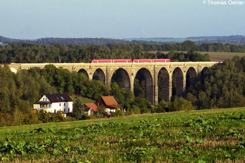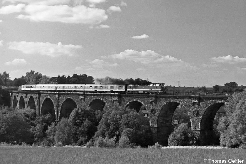 Ein "dampfendes" U-Boot auf dem Bahrebachviadukt über die A4 bei Chemnitz ist der Beleg, dass man auch mit Dieselloks ordentlich Dampf machen kann. Aufnahme vom Sommer 1997. Thomas Oehler