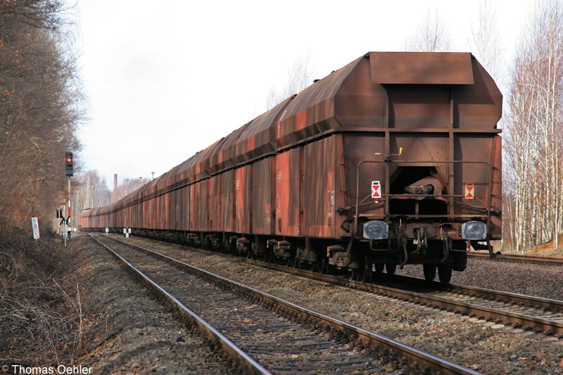 241 449 ist am 03.02.07 mit dem Kohlezug zwischen Chemnitz-Küchwald und Chemnitz-Borna Hp unterwegs. Der Zug fährt allerdings nicht nach Leipzig, wie man vielleicht vermuten könnte. Nachdem in Küchwald eine Doppelkreuzungsweiche ausgebaut wurde, ist es nicht mehr möglich direkt von Chemnitz Hbf nach Küchwald bzw. Chemnitz Glösa zu fahren. Der lange Kohlezug muss auf dem Streckengleis fast bis Hp Borna vorfahren, um dann den Zug rückwärts nach Bf Küchwald reinzudrücken. Umgedreht ist das mit dem Leerzug die gleiche Prozedur. Alles in allem ein sehr merk- u. fragwürdiger Betriebsablauf. Thomas Oehler