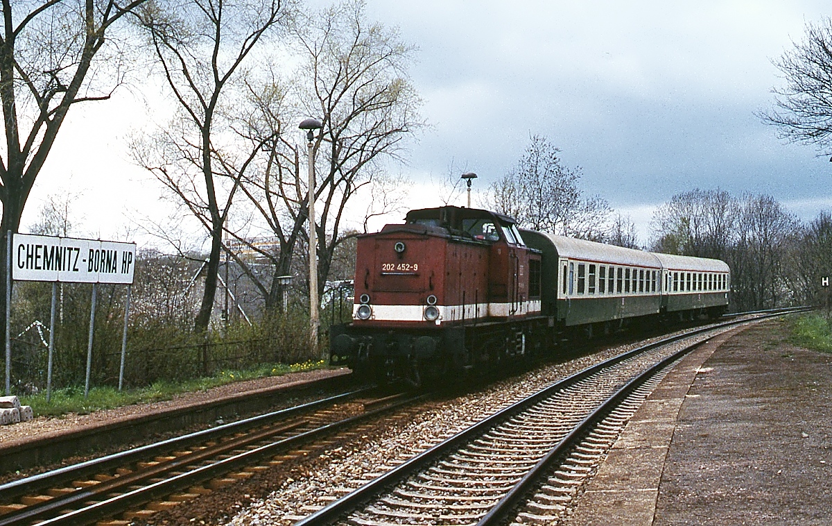 202 452-9 (LEW 13491/1972, ex DR 112 452-8, Ausmusterung 28.02.1998) fährt Ende April 1997 im Haltepunkt Chemnitz-Borna ein