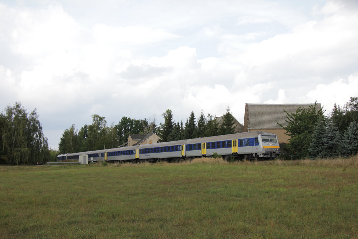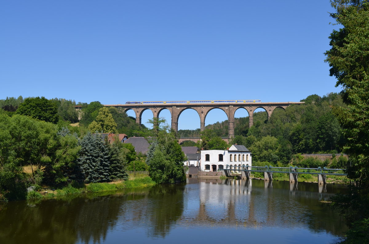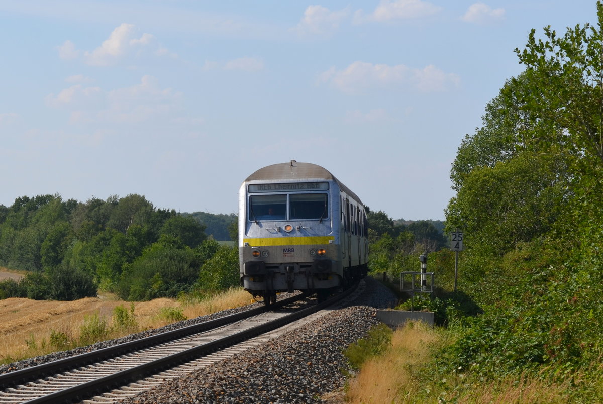Der RE6 der Mitteldeutschen Regiobahn (kurz MRB) fährt planmäßig mit einem y-Steuerwagen, vier Abteilwagen und der Schublok 223 144 durch Lauterbach-Steinach. Aufgrund von Bauarbeiten endete dieser Regionalexpress von Leipzig aus kommend schon in Chemnitz-Küchwald. Anton Eisenbach