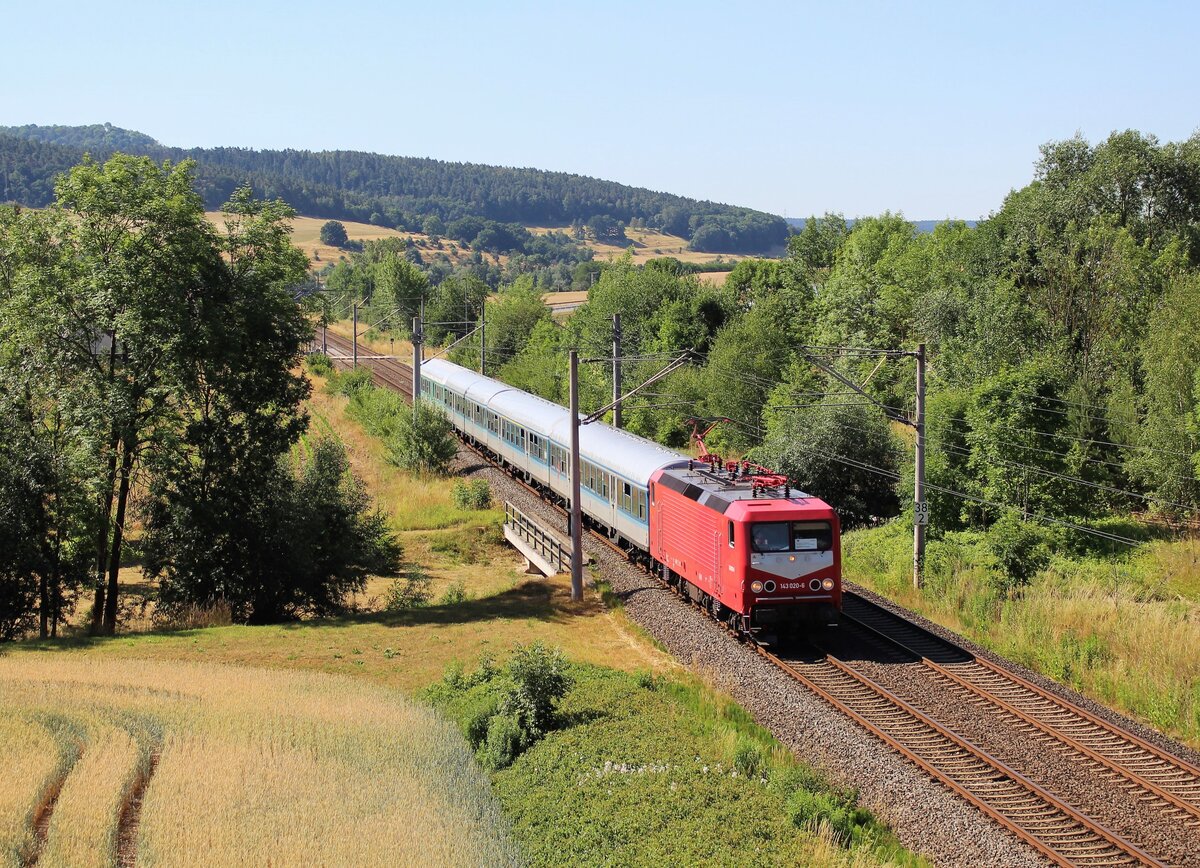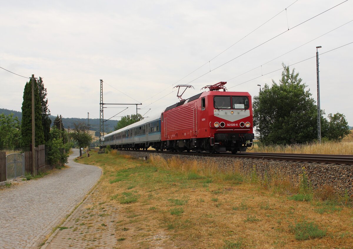 Ab 01.06.22 gab es den RB 25 Ersatzverkehr zwischen Halle-Saalfeld und zurück. RB 31397 fuhr mit 143 020-6 und wurde am 03.07.22 in Schöps abgelichtet. Alexander Hertel