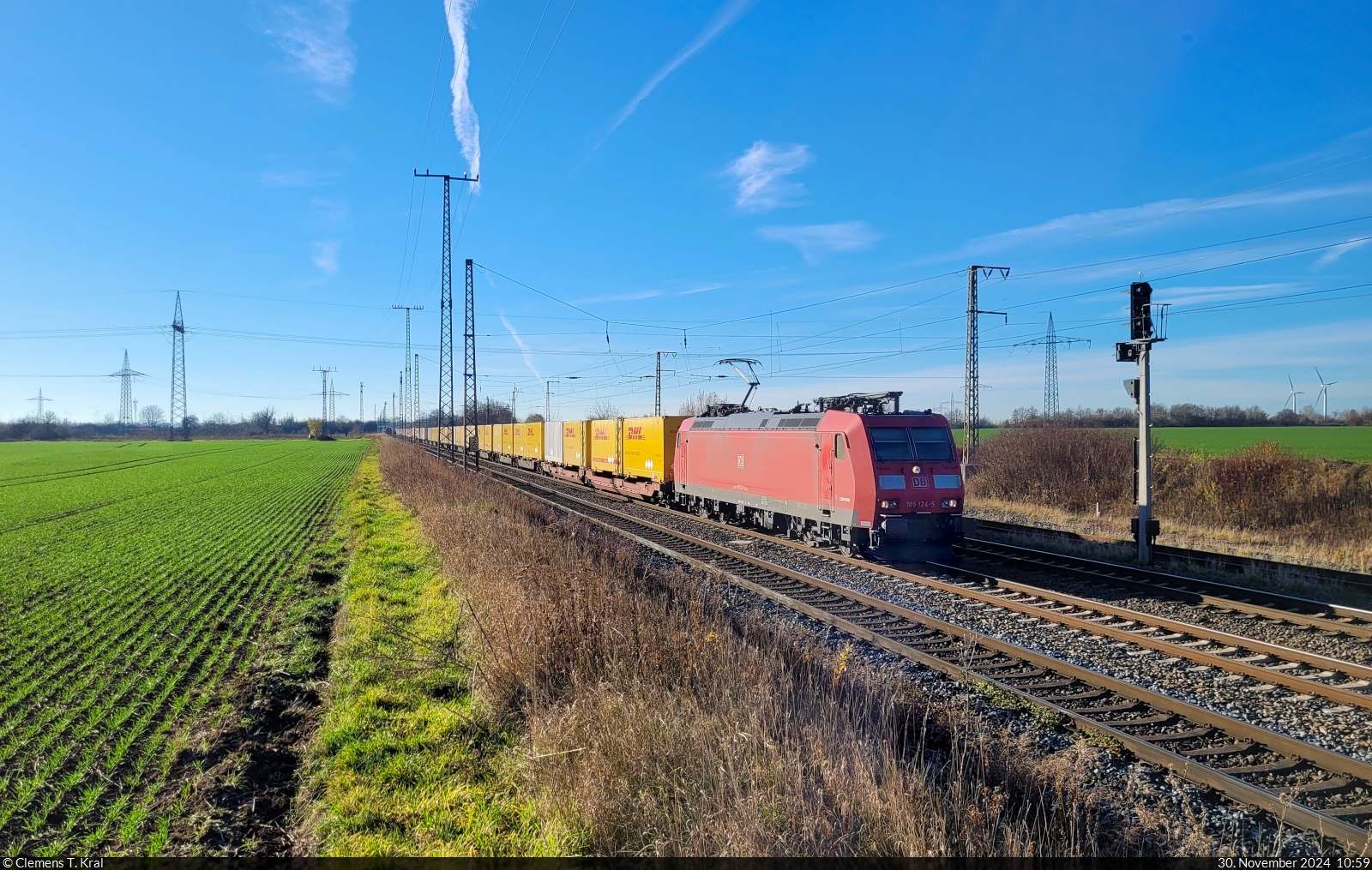 Pünktlichste Güterleistung auf dieser Strecke: der DHL-Containerzug nach Großbeeren, diesmal traktioniert mit 185 124-5 und abgewartet an der südlichen Bahnhofseinfahrt von Großkorbetha.