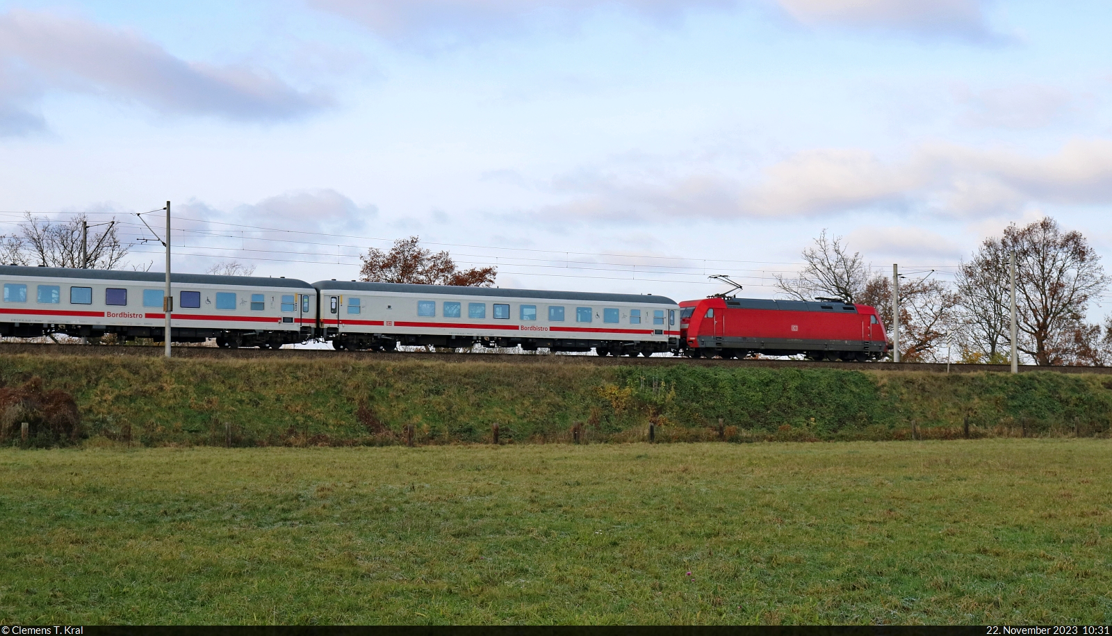 101 072-7 quert mit einigen IC-Bordbistro-Wagen der Bezeichnung "ARkimmbz" die Saale-Elster-Aue bei Kollenbey (Schkopau) Richtung Halle-Ammendorf.