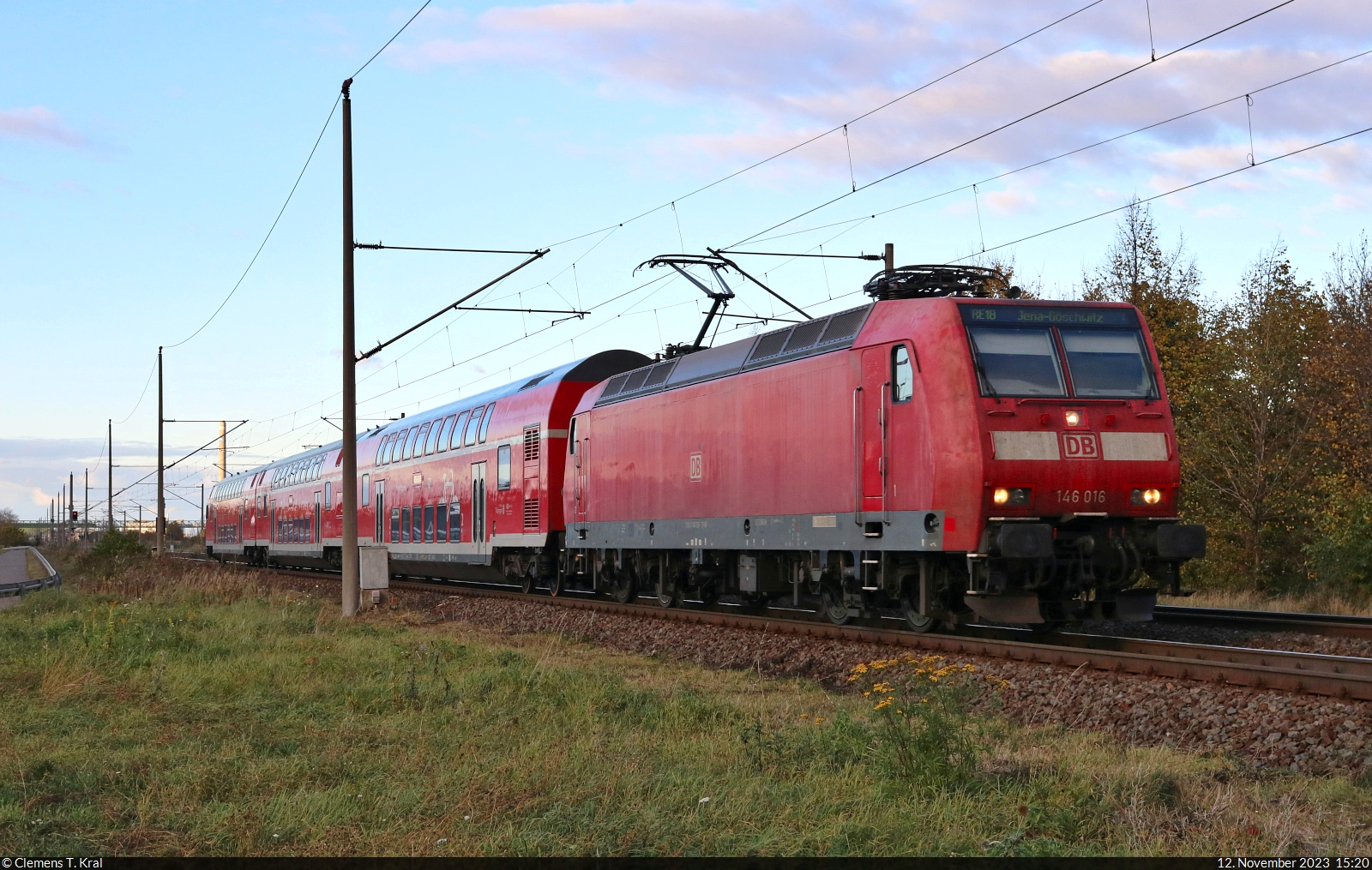 146 016-1 unterwegs unter blauem Himmel im schattigen Spergau.