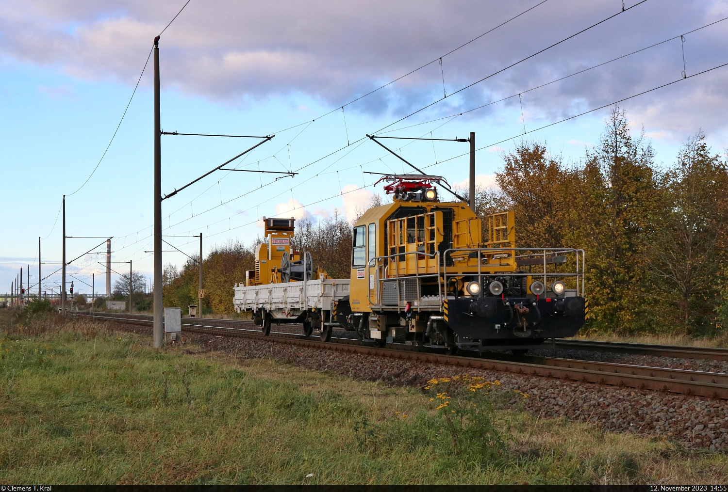 Gleisarbeitsfahrzeug GAF 100 R/H (99 80 9436 014-1 D-SRFL) rollt mit einem unerkannt gebliebenen zweiachsigen Flachwagen bei Spergau Richtung Weißenfels.