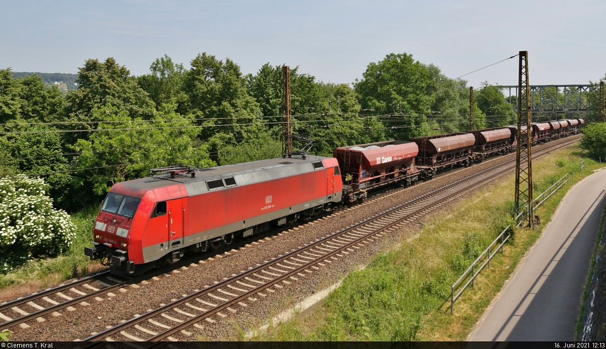 Schotterzug mit 152 096-4 (Siemens ES64F) unterwegs in Naumburg (Saale) Richtung Bad Kösen.