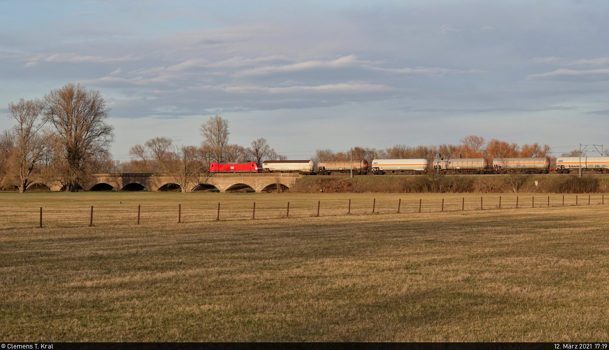 Kesselzug mit Re 482 041-1 befährt die Saalebrücke in Schkopau Richtung Merseburg Hbf.