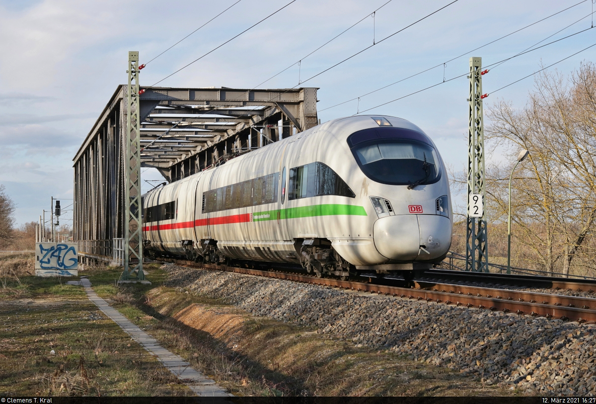 Hier überquert 411 075-5 (Tz 1175 "Villingen-Schwenningen") als Ersatz für einen zwölfteiligen ICE 4 die Saale in Schkopau. Bis nach Erfurt wird er 70 statt wie sonst 32 Minuten brauchen.