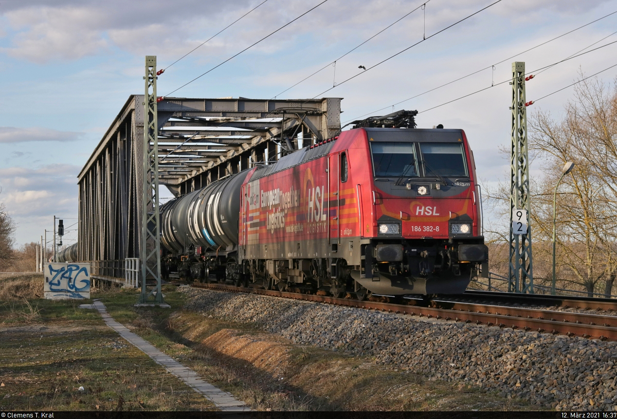 Kesselzug mit 186 382-8 unterwegs in Schkopau Richtung Merseburg Hbf.
