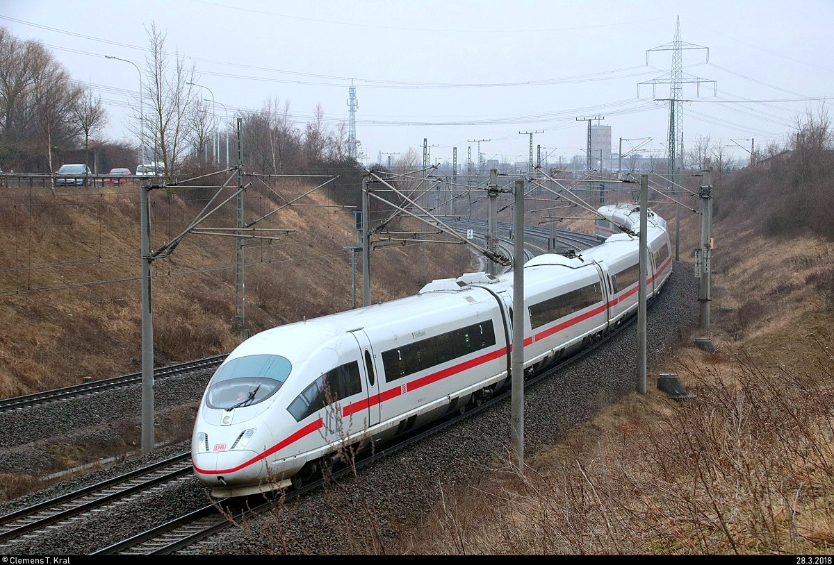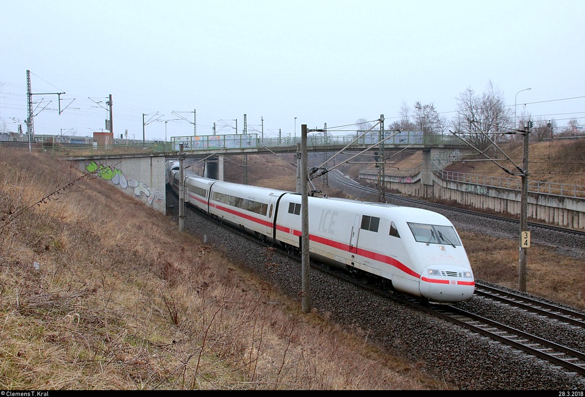 401 051 (Tz 160 "Mülheim an der Ruhr") als verspäteter ICE 597 (Linie 11) von Berlin Hbf (tief) nach München Hbf fährt in Halle (Saale), Kasseler Straße, auf der Bahnstrecke Halle–Bebra (KBS 580). [28.3.2018 | 10:51 Uhr] Clemens Kral
