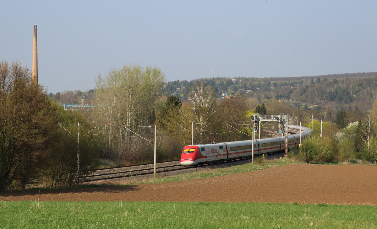 Mit ca. fünf Minuten Verspätung kam dann der Zug den ich eigentlich fotografieren wollte: Tz "Konstanz" als ICE-Sprinter 1638 (Berlin - Erfurt - Frankfurt(Main) Hbf). Zwischen Berlin und Erfurt fährt dieser Zug zusammen mit ICE1001 (Berlin - Erfurt - München). Regelmäßig kommt es bei diesen beiden Zügen zu technischen Störungen beim Entkuppeln in Erfurt oder durch das Zugsicherungssystem ETCS Level2.