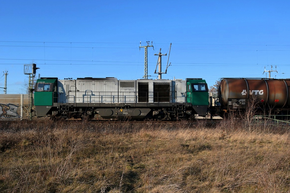 Eine BR 272 (Vossloh G 2000 BB) als Kesselzug befährt in Halle (Saale), Kasseler Straße, das Verbindungsgleis zur Bahnstrecke Halle–Bebra (KBS 580) in südlicher Richtung. [29.12.2017 | 13:54 Uhr] Clemens Kral