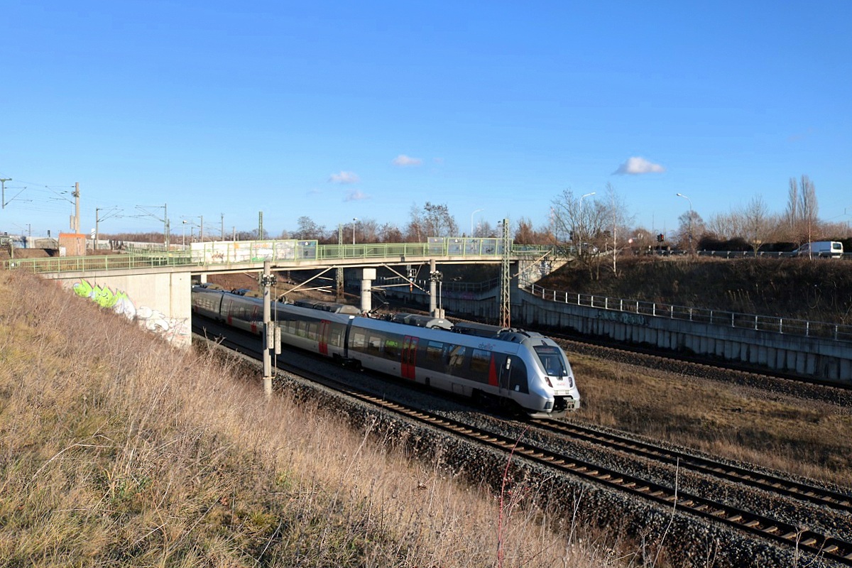 Eine BR 9442 (Bombardier Talent 2) von Abellio Rail Mitteldeutschland als RE 74567 (RE16) von Erfurt Hbf nach Halle(Saale)Hbf fährt in Halle (Saale), Kasseler Straße, auf der Bahnstrecke Halle–Bebra (KBS 580). [29.12.2017 | 13:51 Uhr] Clemens Kral