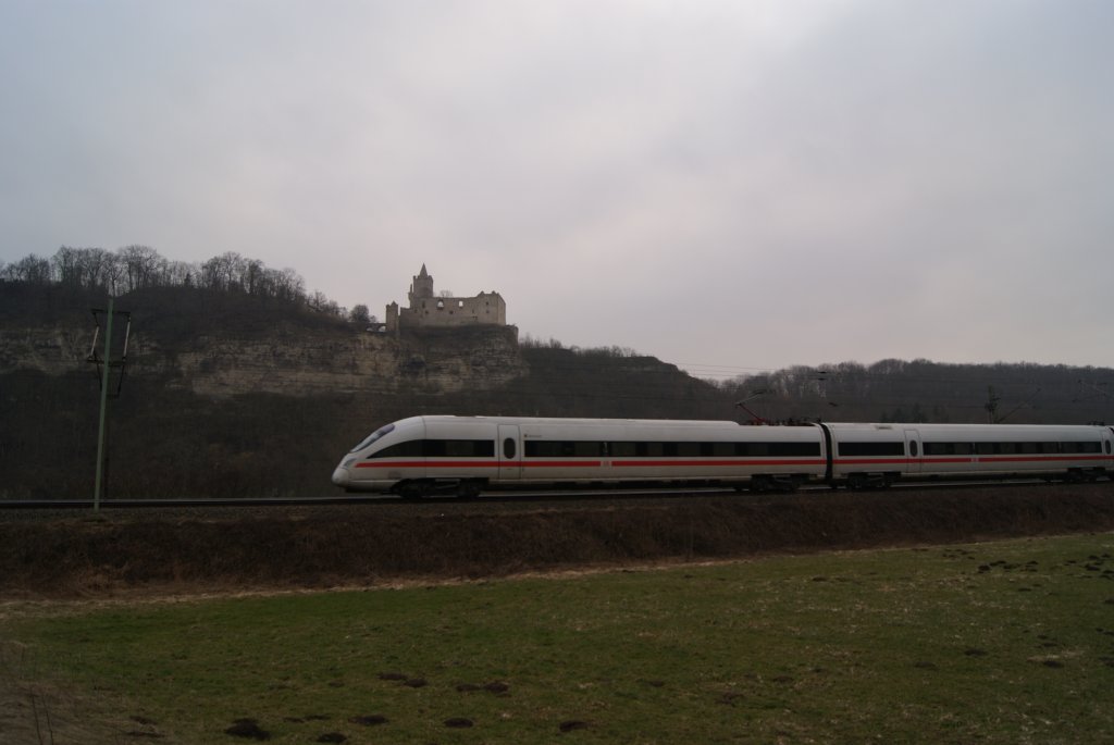 ICE "Weimar" im Saaletal an der Rudelsburg nahe Bad Kösen ,Richtung Naumburg fahrend.Kurioses,der Oberleitungsmast links im Bild neigt zur Seite, 14.02.2011 Mario Schneider