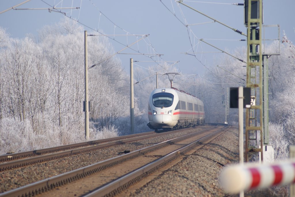 ICE "Leipzig" bei der Durchfahrt im HP Schkortleben ( nur Strecke Deuben - Großkorbetha )in Richtung Großkorbetha fahrend,der Lampenmast am linken Bildrand neigt sich altersbedingt nach rechts,am 06.12.2010 Mario Schneider