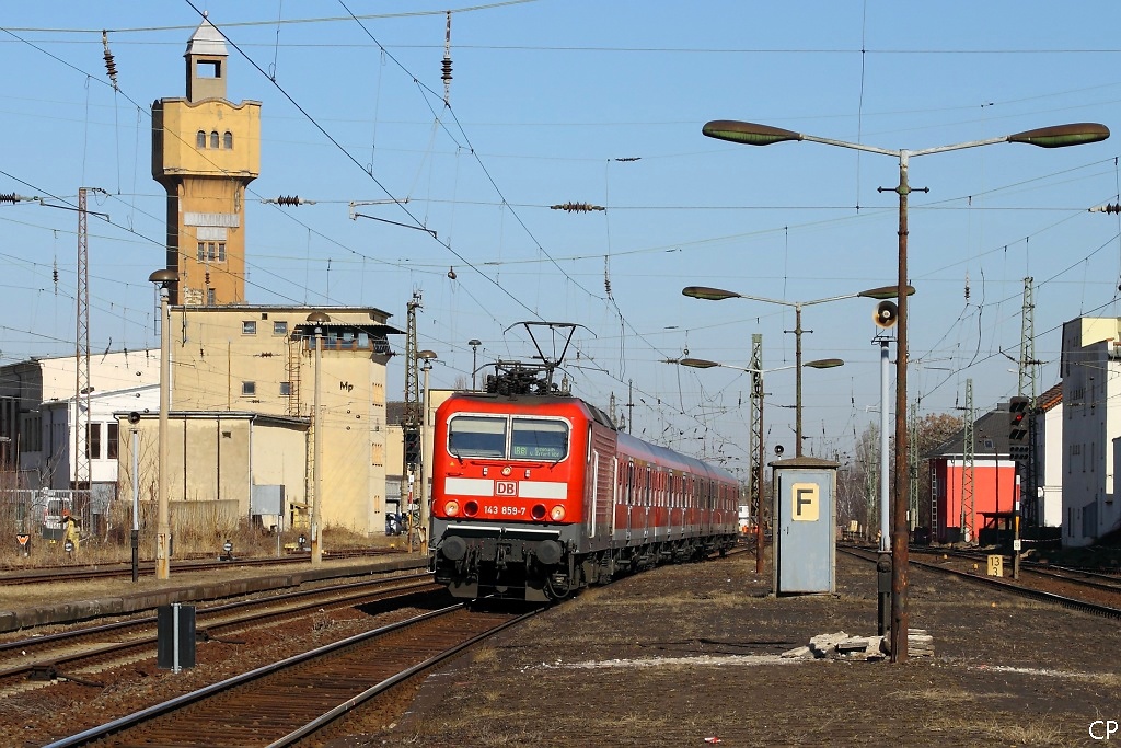 Obwohl seit dem Fahrplanwechsel eigentlich nur noch Loks der BR 182 auf der RB-Linie Halle-Eisenach fahren sollten, sieht man doch immer mal wieder die alteingessenen 143er an den Zügen. Am 8.3.2011 fährt 143 859-7 mit der RB 16316 in Merseburg ein. Im Hintergrund ist der markante Turm des Alufolie-Werks zu sehen, davor das Stellwerk Mp. Christopher Pätz