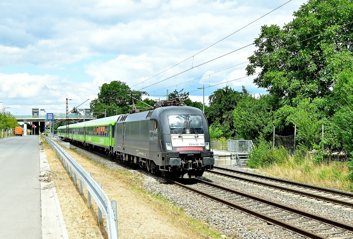 ... entschwindet um die Ecke, während ihn ein ICE 4 überholt. Diese hatte vor der Main-Neckar-Brücke einige Minuten gewartet, wird ab vor dem ICE 3 in den Frankfurter Hbf einfahren, der wiederum hier einige Minuten auf seine Einfahrt warten muss.