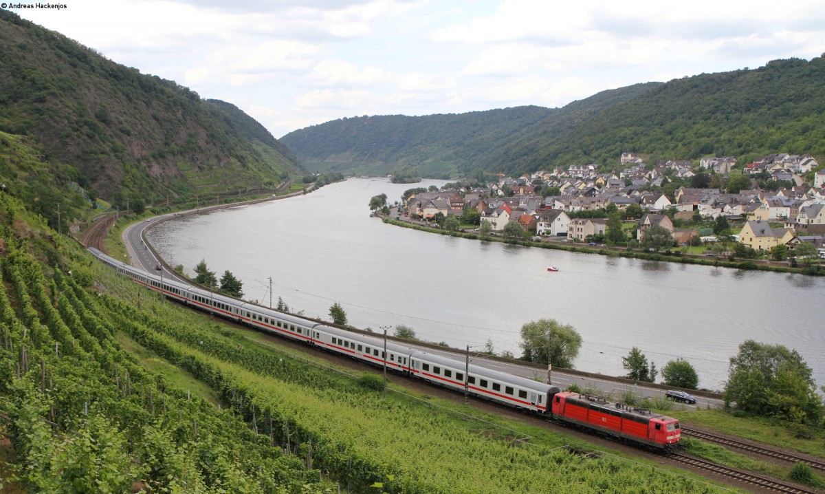 181 223-9 zieht am 08.08.2014 den IC 133 von Luxemburg nach Norddeich durch das Moseltal bei Winningen. Im Hintergrund die 1969 bis 1972 errichtete Moseltalbrücke. Christopher Pätz
