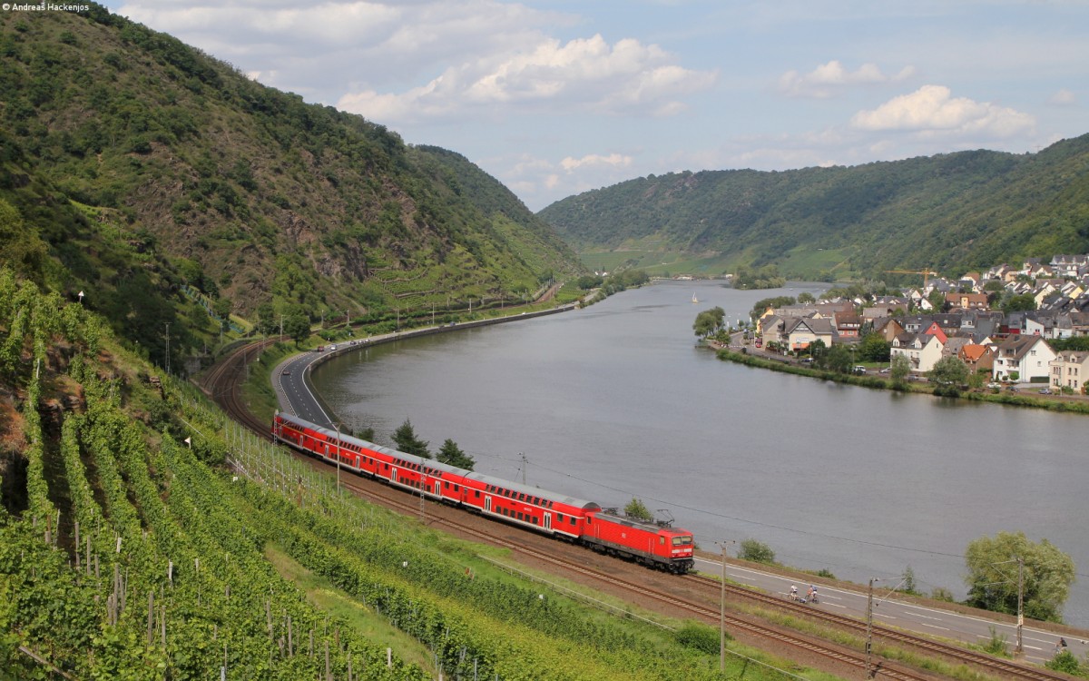 Geschoben von einer 143er fährt der RE 1 Mosel-Saar-Express (Saarbrücken - Trier - Koblenz) Steuerwagen voraus entlang der Mosel in Richtung Koblenz, hier am 18.07.2012 bei Kobern-Gondorf. Armin Schwarz