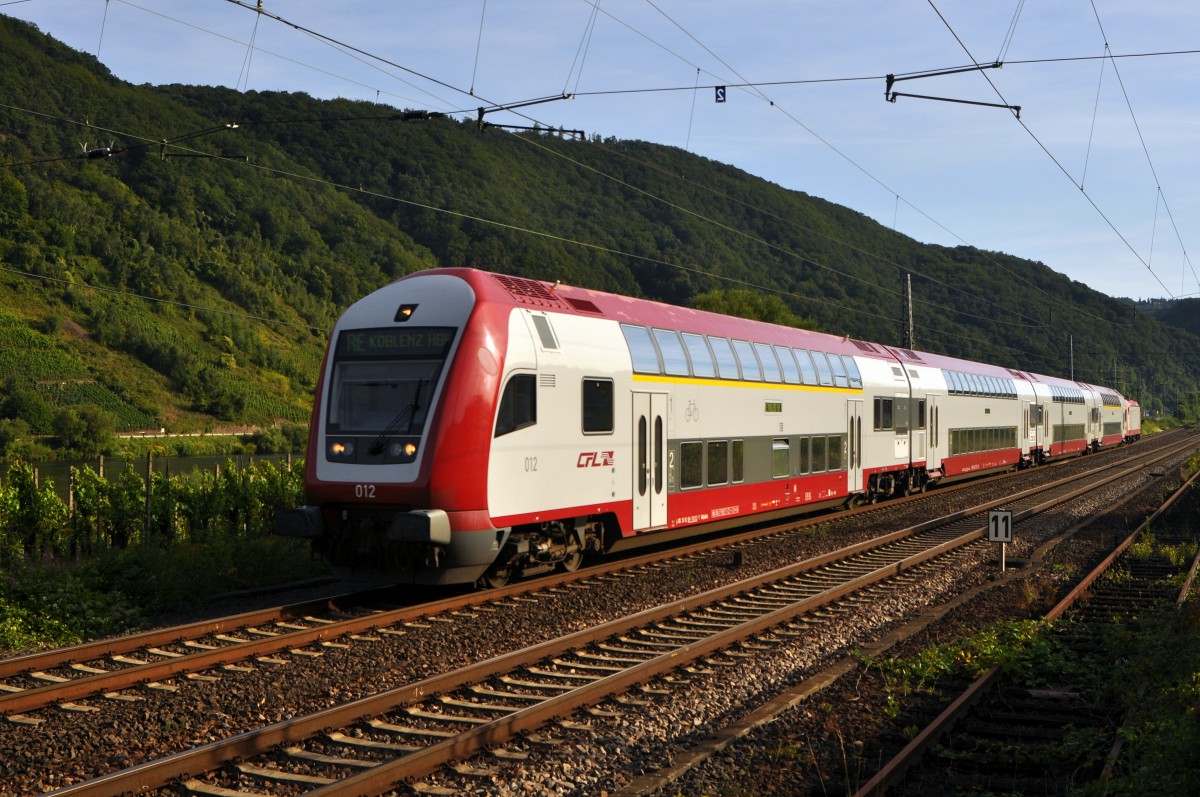 Mit CFL Steuerwagen 012 voraus befindet sich RE 11 (5251) am Abend des 17.08.12 in Winningen/Mosel auf dem Weg von Luxemburg nach Koblenz Hbf, es schiebt CFL 4014. Reinhard Kühn
