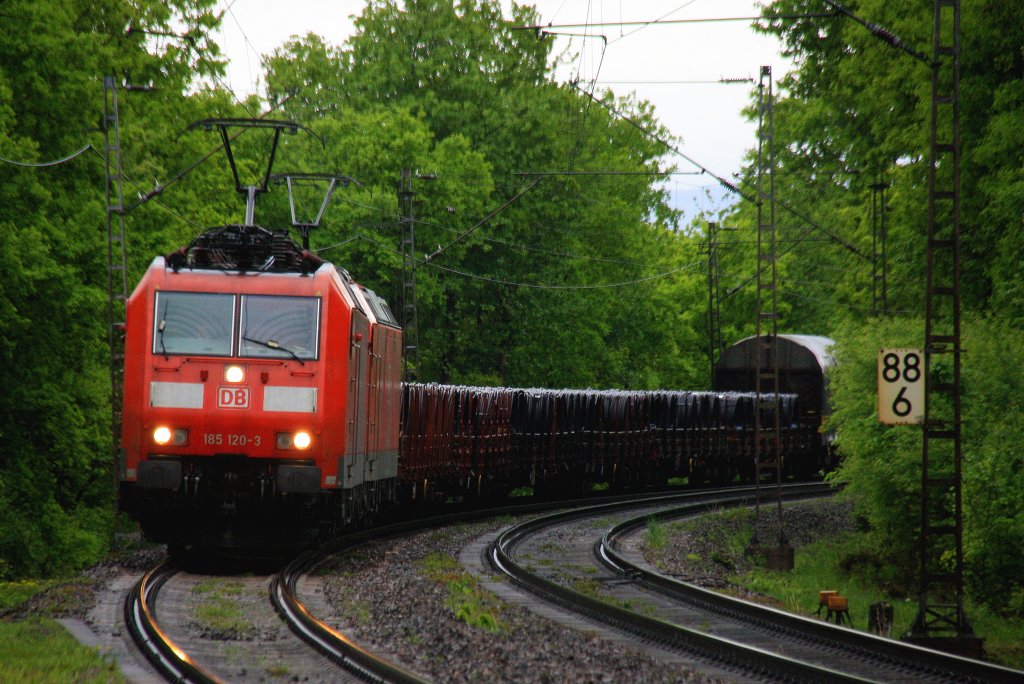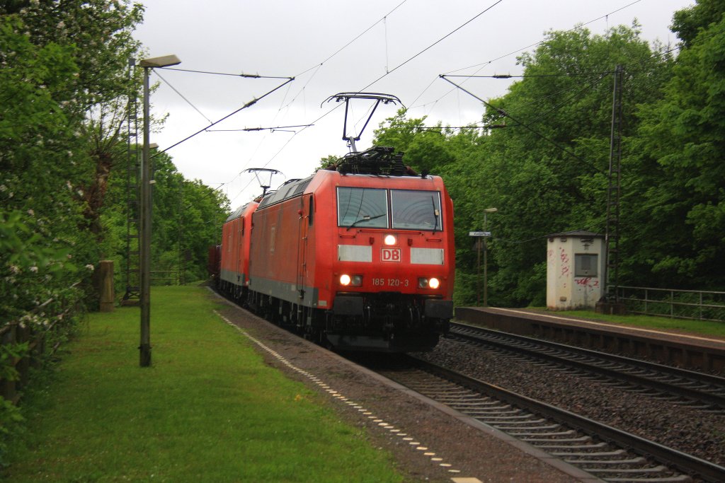 185 120-3 und eine weitere 185er beide von DB kommen durch Sehlem mit einem langen gemischten Güterzug aus Richtung Trier-Ehrang und in Richtung Koblenz bei Regen am 19.5.2013. Stefan Hochstetter