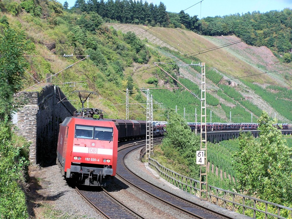152 020 4 mit einem Güterzug auf dem Pündericher Hangviadukt. Aufgenommen am 28.08.2009