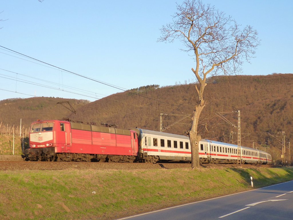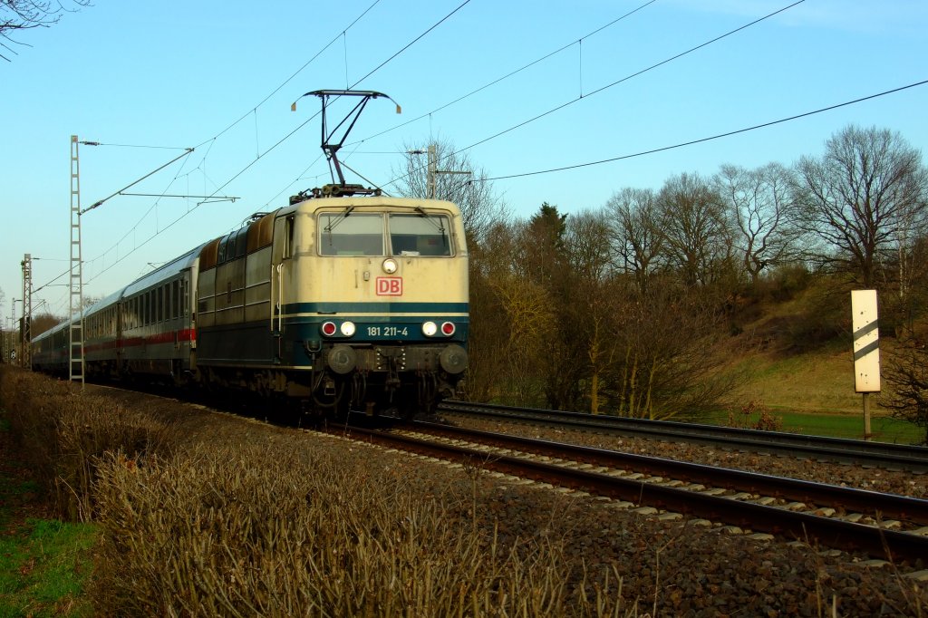 Mit dem um ca. 15 Minuten verspäteten IC 134 zeigt sich hier 181 211 (Mosel) zwischen den Haltepunkten Hetzerath und Föhren auf der Moselstrecke gen Trier. Föhren, der 20.3.2011