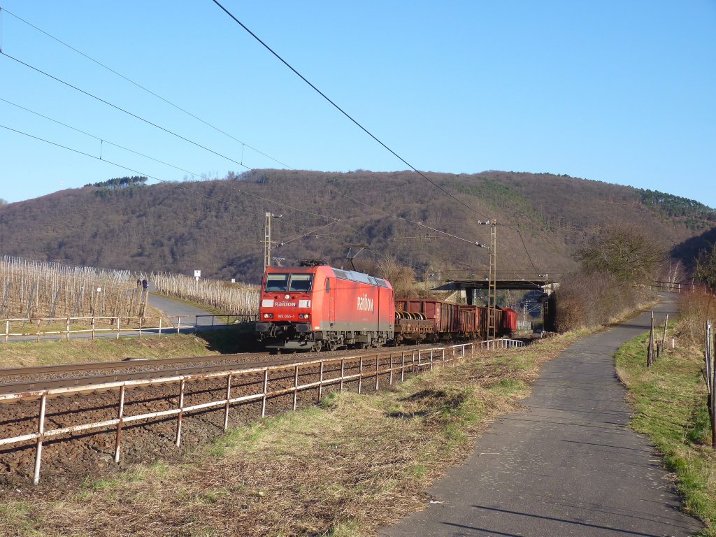 185 055 am 7.3.11 mit einem kurzen Güterzug in Winningen (Mosel) Richtung Ehrang.