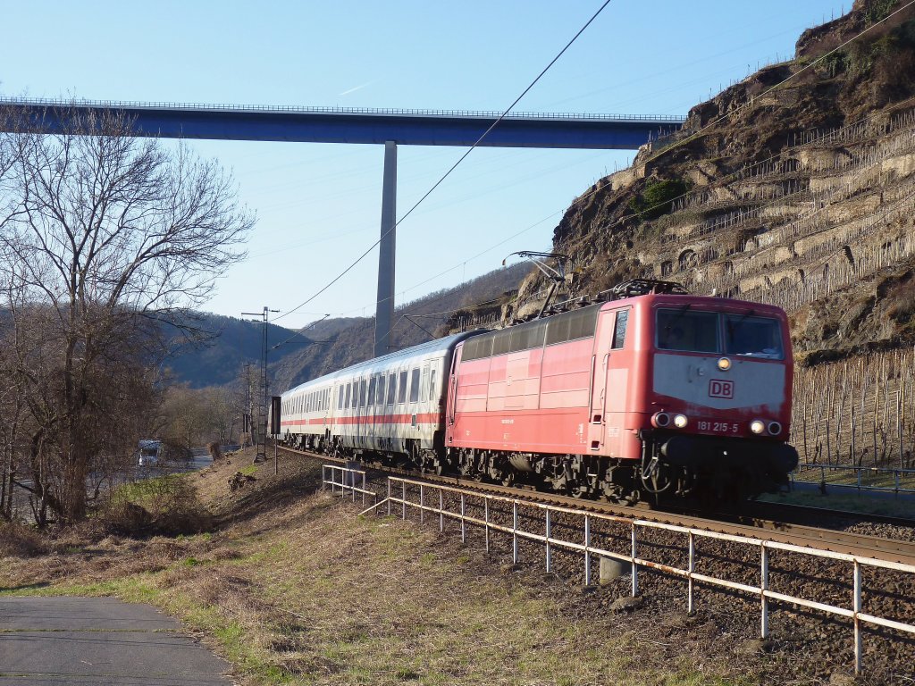 Im Streiflicht passiert 181 215 am 7.3.11 den IC 137 Luxembourg - Emden die große Autobahnbrücke in Winningen (Mosel).