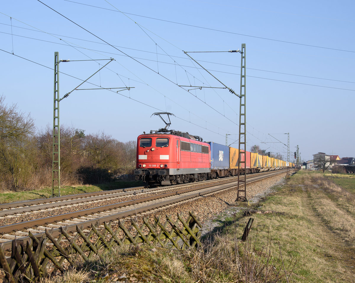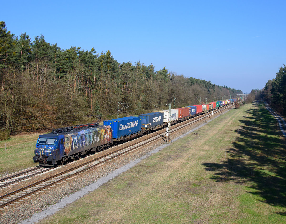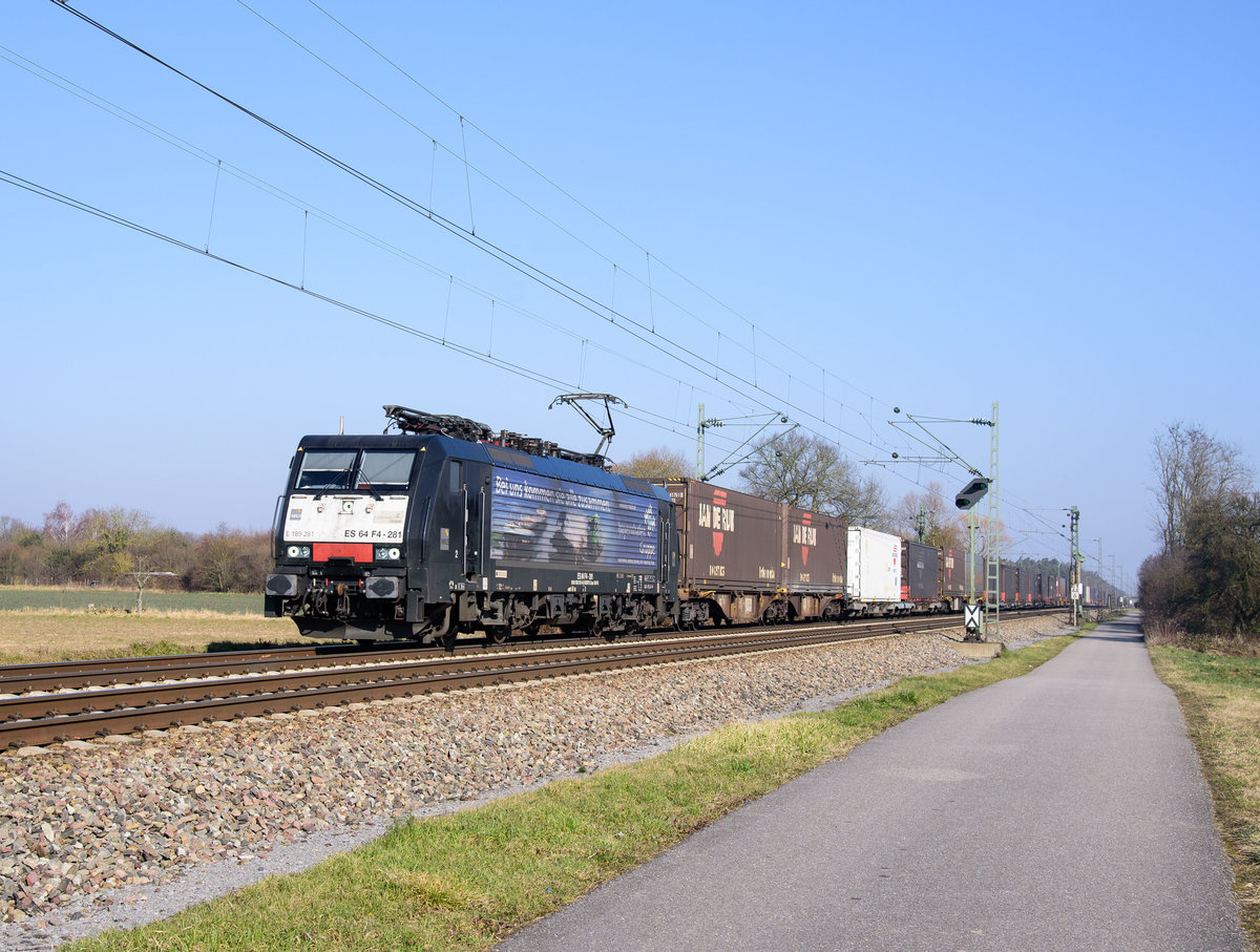 ES 64 F4-281 Bayernhafen mit Containern in Richtung Karlsruhe.(Stutensee 24.2.2018).