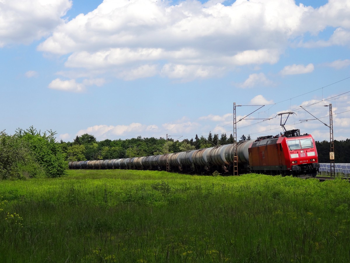 185 119 und eine weitere 185 ziehen am 28.8.13 einen Güterzug über die Rheinbahn, Richtung Mannheim.