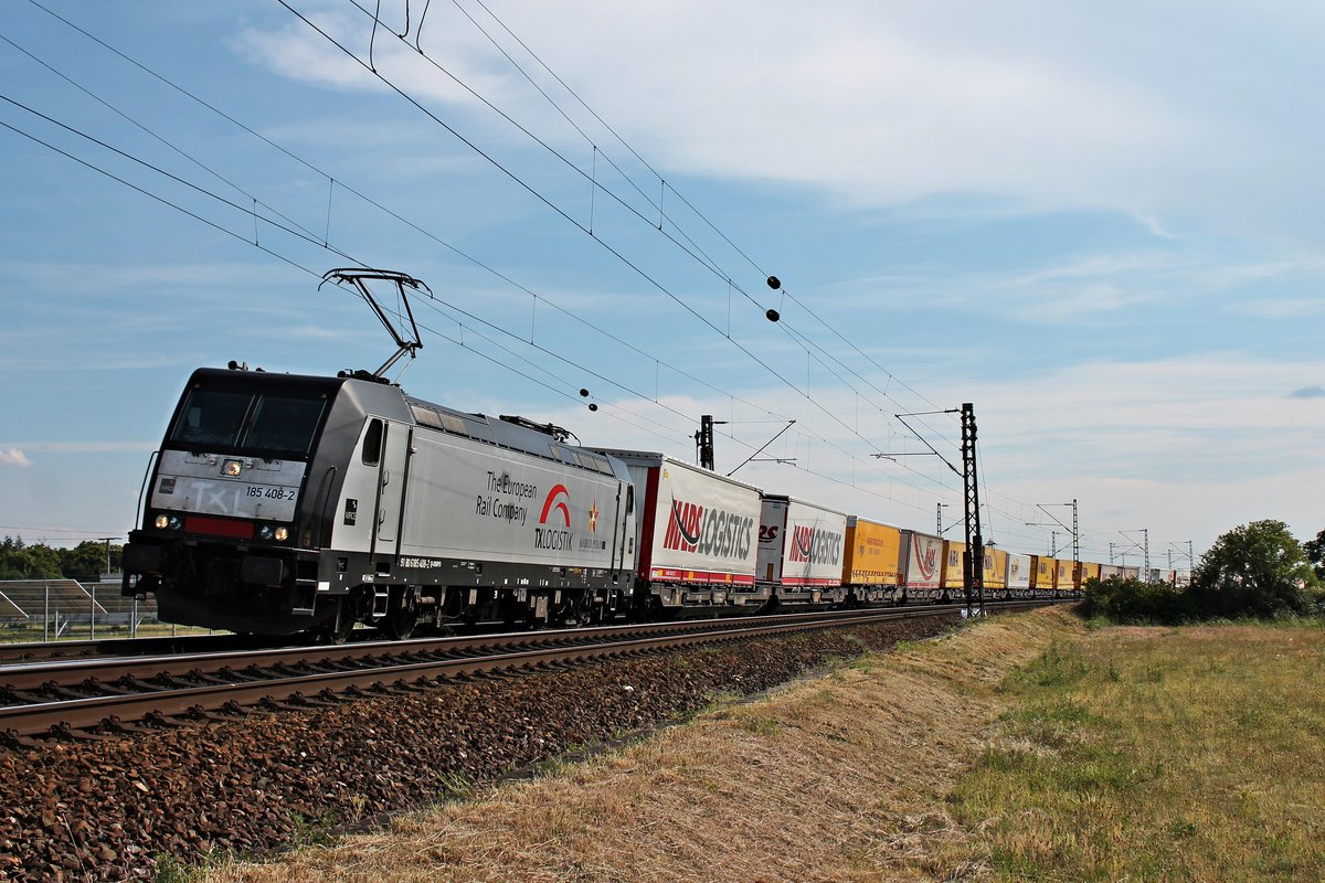 Mit dem DGS 45674 (Trieste Campo Marzio - Bettembourg Marchandises) fuhr am späten Nachmittag des 03.06.2020 die MRCE/TXL 185 408-2 "TXLOGISTIK - Marco Polo" nördlich von Waghäsuel über die KBS 700 (Rheinbahn) in Richtung Mannheim. Tobias Schmidt