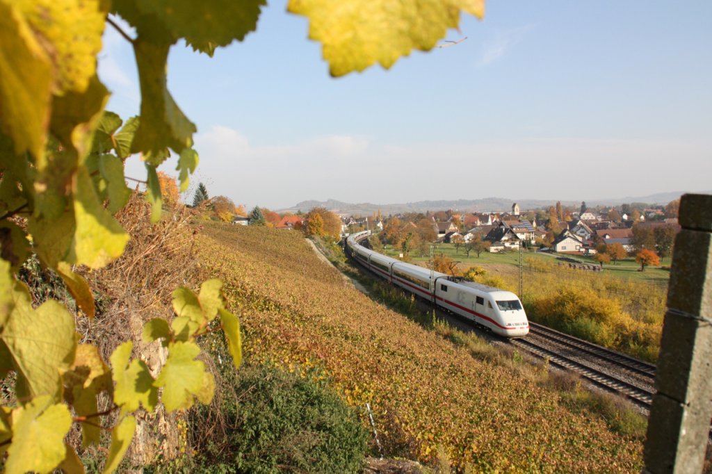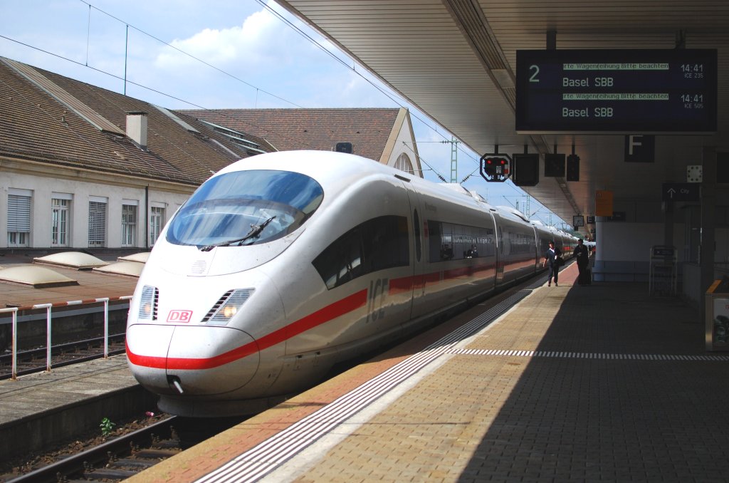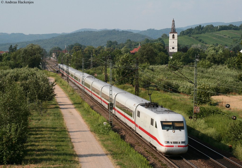 Ein zweiteiliger ICE 3 bei der Parallelfahrt mit einem ICE 1 bei Efrigen Kirchen/ Istein. Auf der Strecke KBS 703.