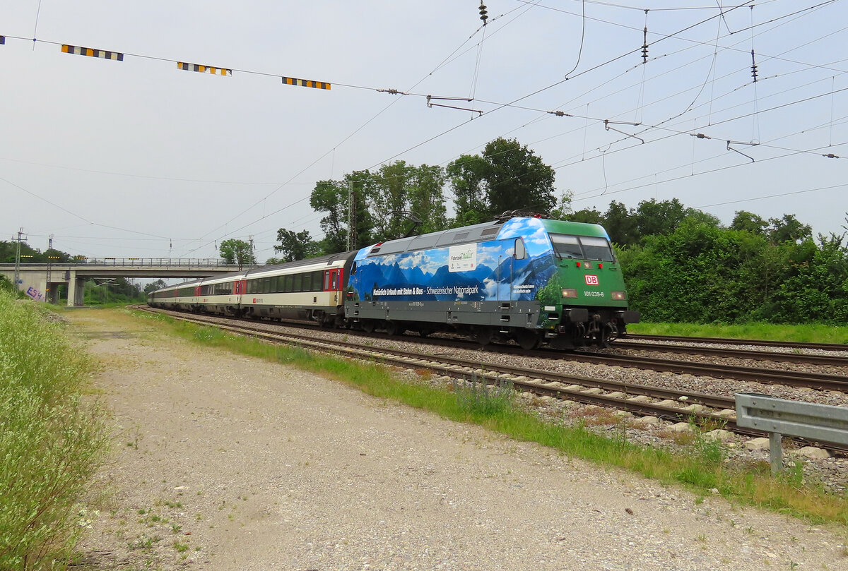 Riegel - 29. Juni 2024 : Werbelok 101 039 "Fahrtziel Natur - Schweizerische Naturpark"mit dem EC 9 von Hamburg Altona nach Interlaken Ost.