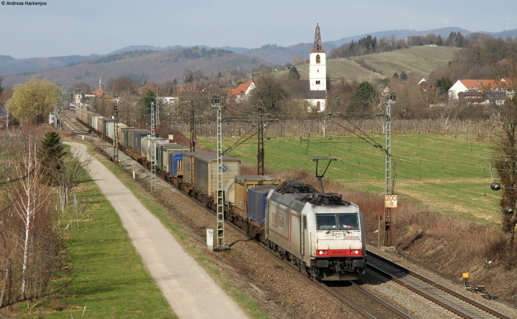 403 022-5  Solingen  + Fußball-ICE 403 012-8  Montabaur  als ICE 503 (Hannover-Basel über Köln) am 17.03.2012 bei Teningen.