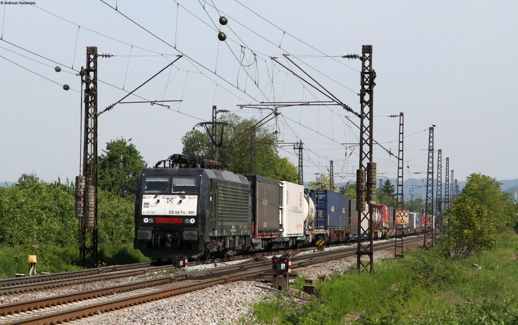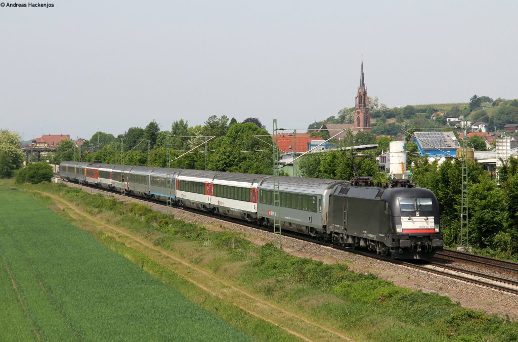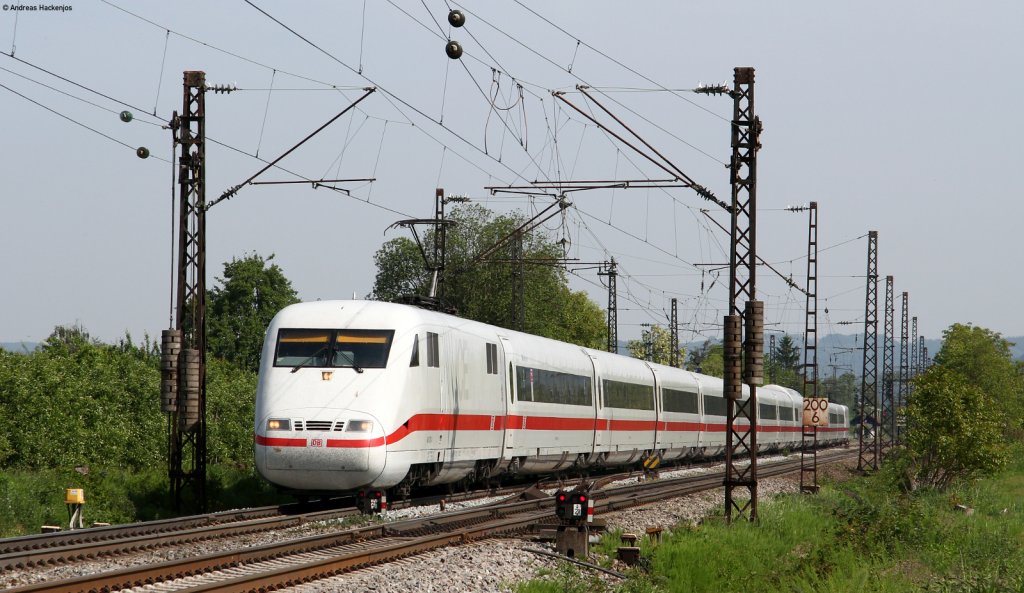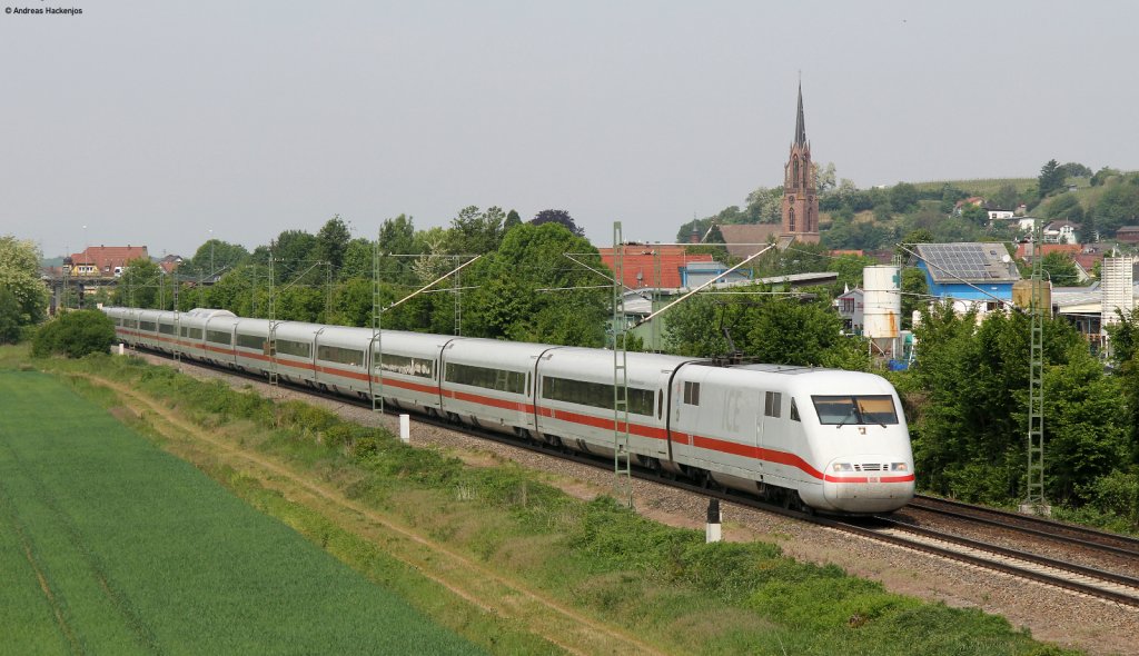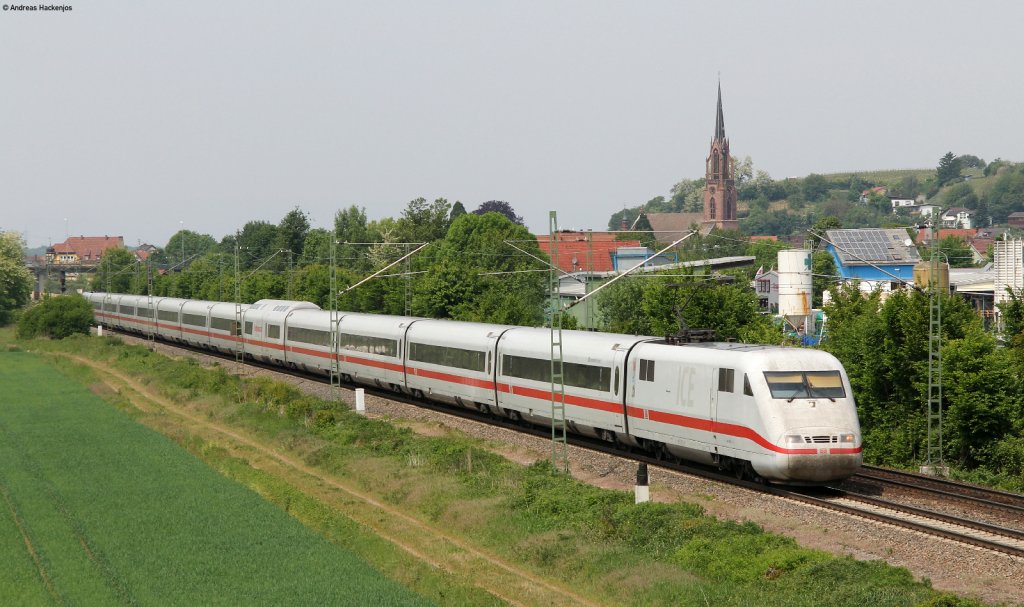 403 017-7 "Recklinghausen" und 403 054-0 "Frauen Fußball WM 2011" als ICE 208 (Basel SBB-Dortmund Hbf) am 7. Mai 2011 bei Teningen.