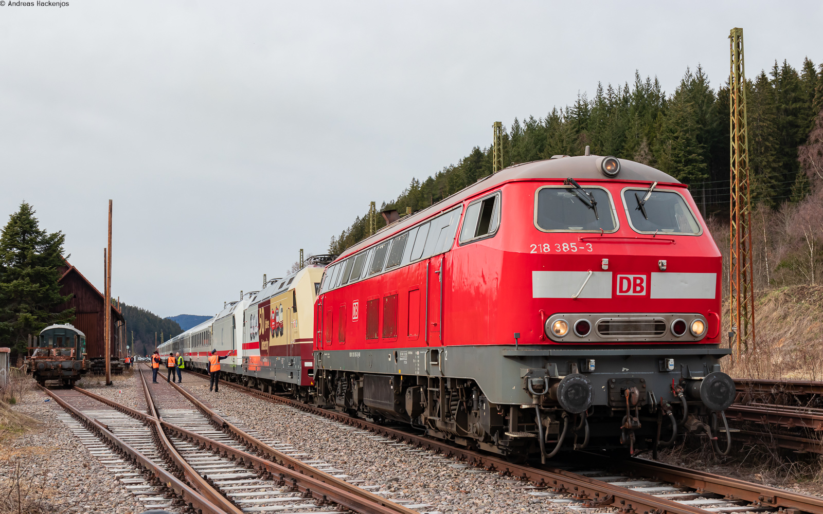 218 385 zieht 101 110  50 Jahre IC  und 101 013  IC  mit dem IR 2217  Höllental  (Frankfurt(Main)Hbf - Seebrugg) in die Abstellgruppe des Bahnhof Seebrugg 21.2.24. Im Rahmen der Sonderfahrt war der Zugang zum Gelände der IG 3 Seenbahn erlaubt.