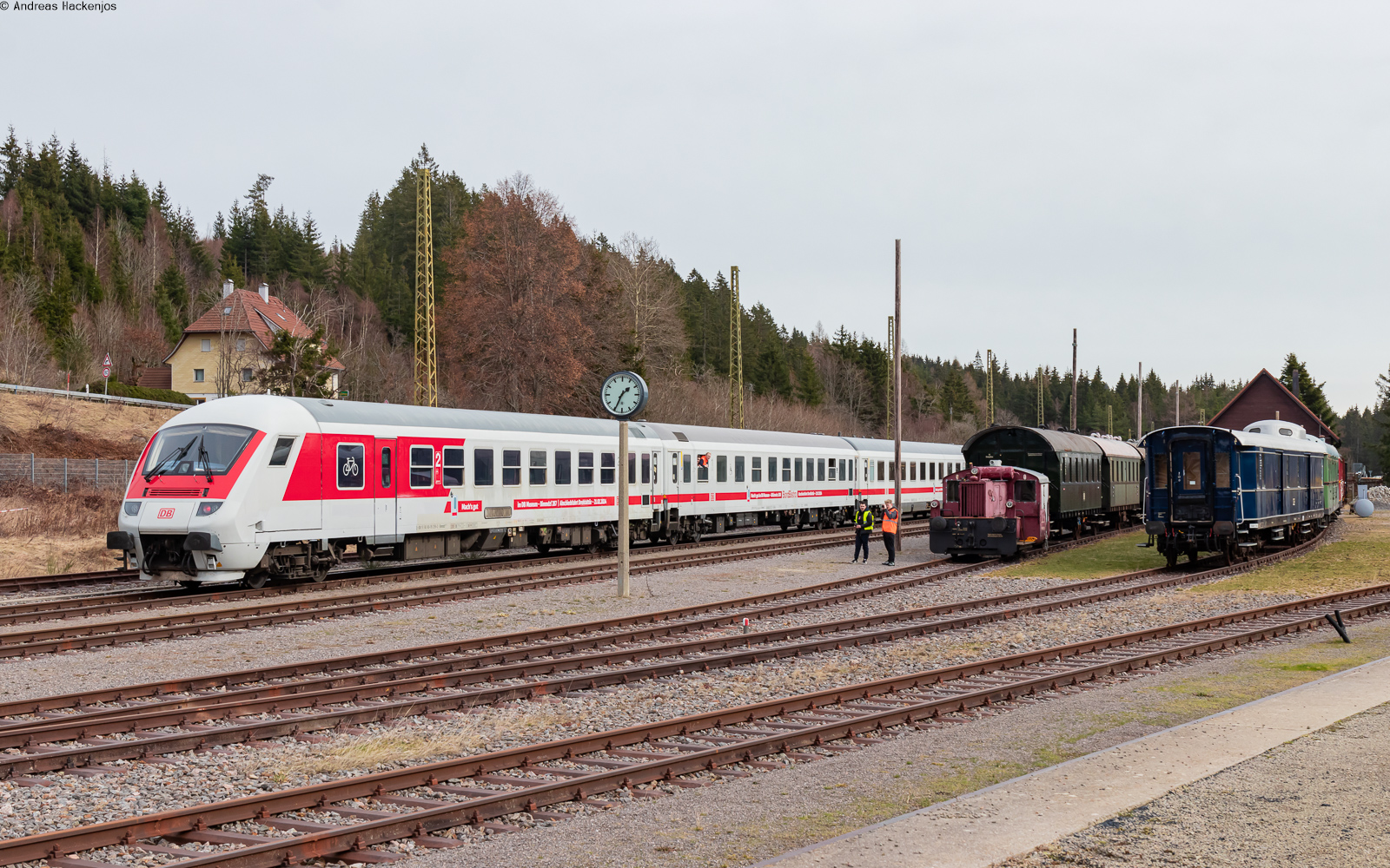 IC 2216 "Höllental" (Seebrugg - Koblenz Hbf) mit 101 013 wird von 218 385 an den Bahnsteig in Seebrugg bereit gestellt 21.2.24. Im Rahmen der Sonderfahrt war der Zugang zum Gelände der IG 3 Seenbahn gestattet.