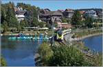 Bild 5 führt an einen kleinen Ort an einem idyllischen See, wo Züge in den BW Landesfarben das Betriebsgeschehen bestimmen: der DB 1440 861 hat gerade den Bahnhof Schluchsee verlassen und fährt nun am gleichnamigen See entlang seinem Ziel Seebrugg entgegen. 25. September 2023